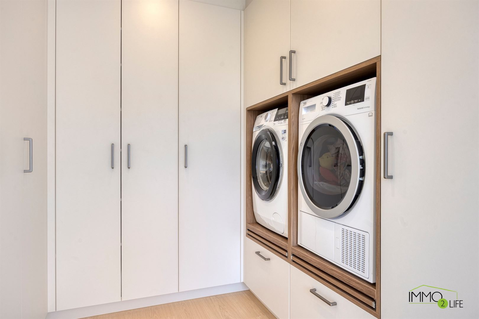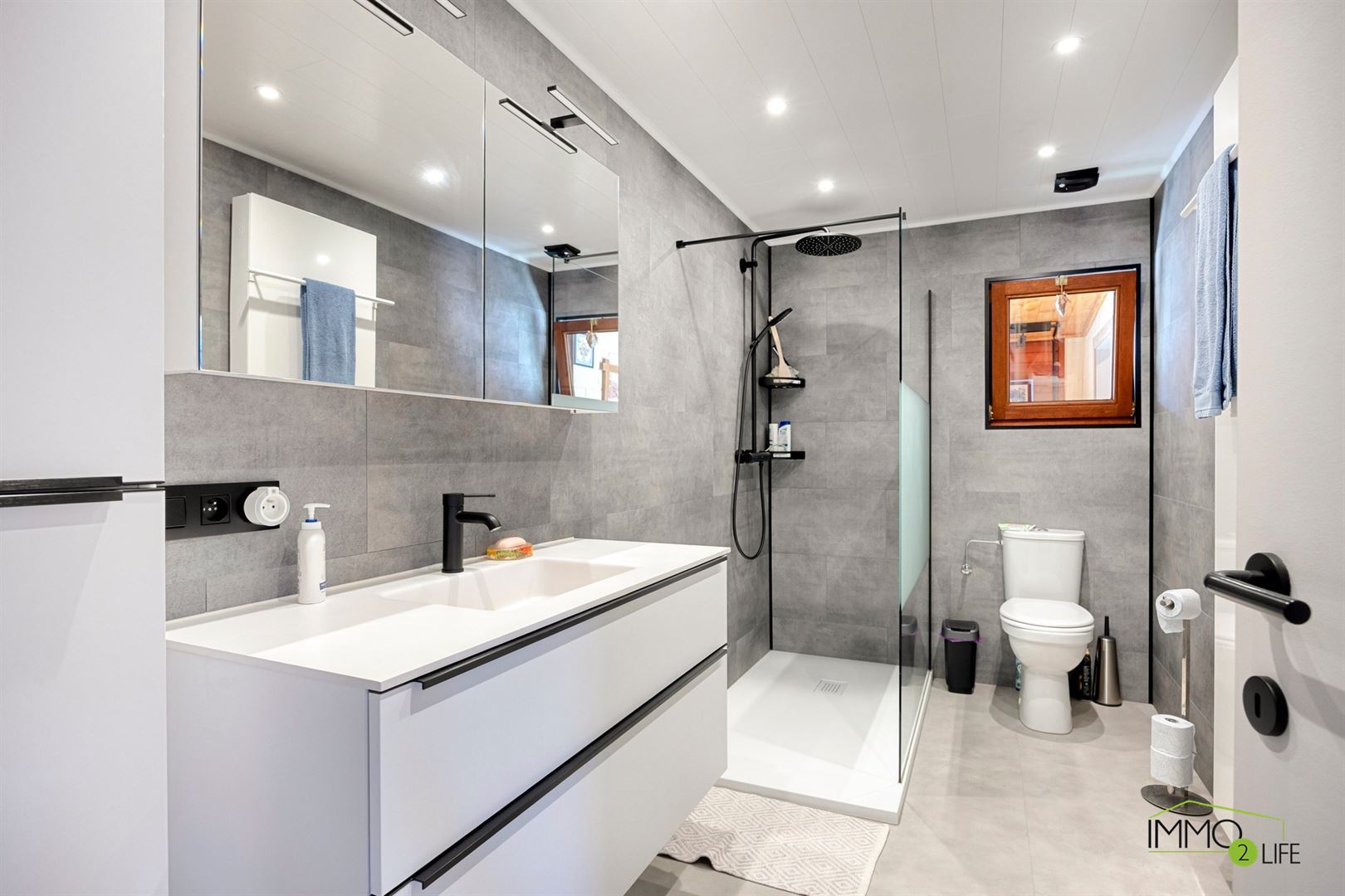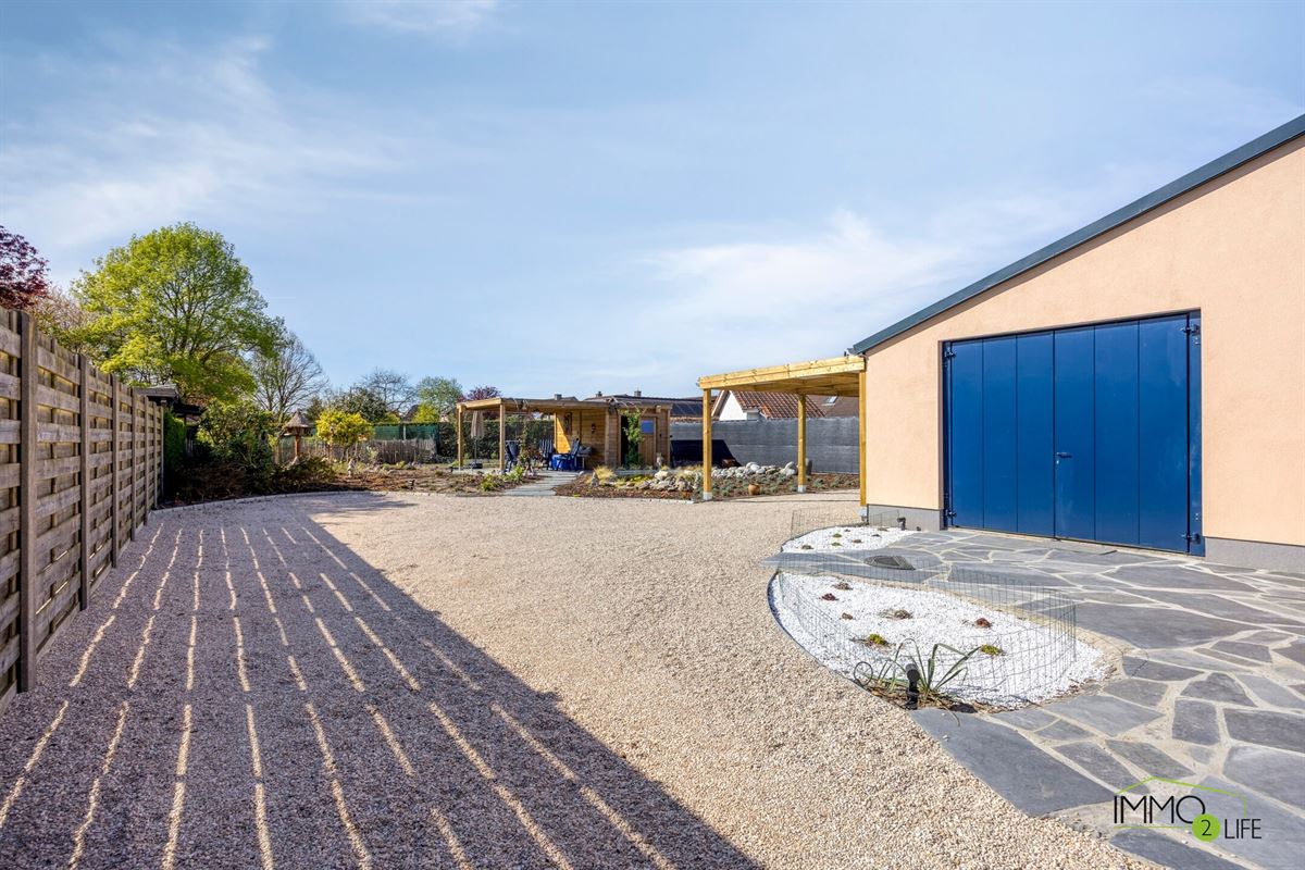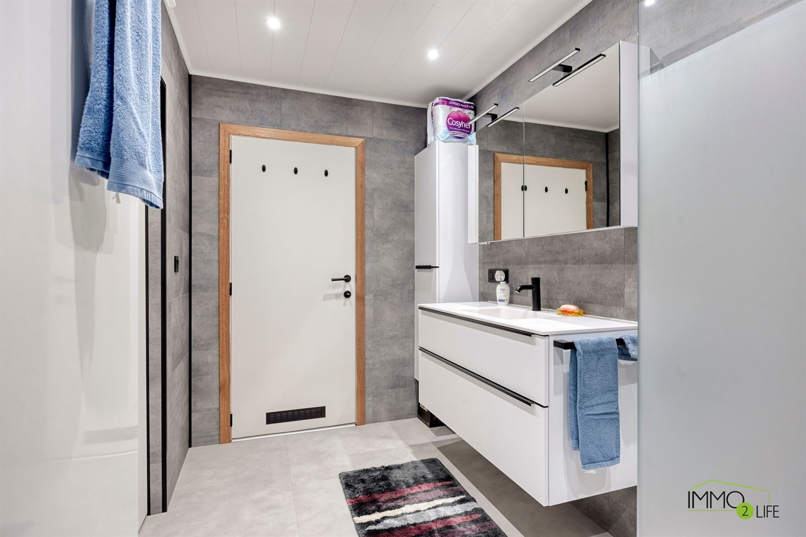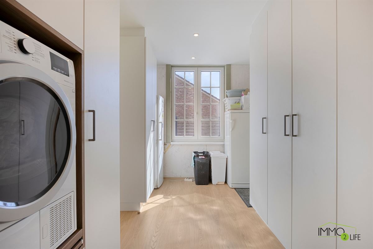 De woning verwelkomt u via een verzorgde inkomhal en biedt een lichtrijke, ruime woon- en eetkamer met directe toegang tot de westgeoriënteerde veranda, waar u geniet van een prachtig zicht op de tuin. Aansluitend bevindt zich de volledig ingebouwde keuken, uitgerust met kwalitatieve toestellen. Verder beschikt de woning over een praktische wasruimte met maatkasten en discreet weggewerkte toestellen, met toegang tot zowel de garage als de tuin met vijver en de aanpalende carport. De badkamer is voorzien van een douche, toilet en wastafel en sluit aan op de master bedroom. Daarnaast bevindt zich naast de inkomhal een 2de volwaardige slaapkamer, die eveneens toegang biedt tot de zolderruimte.