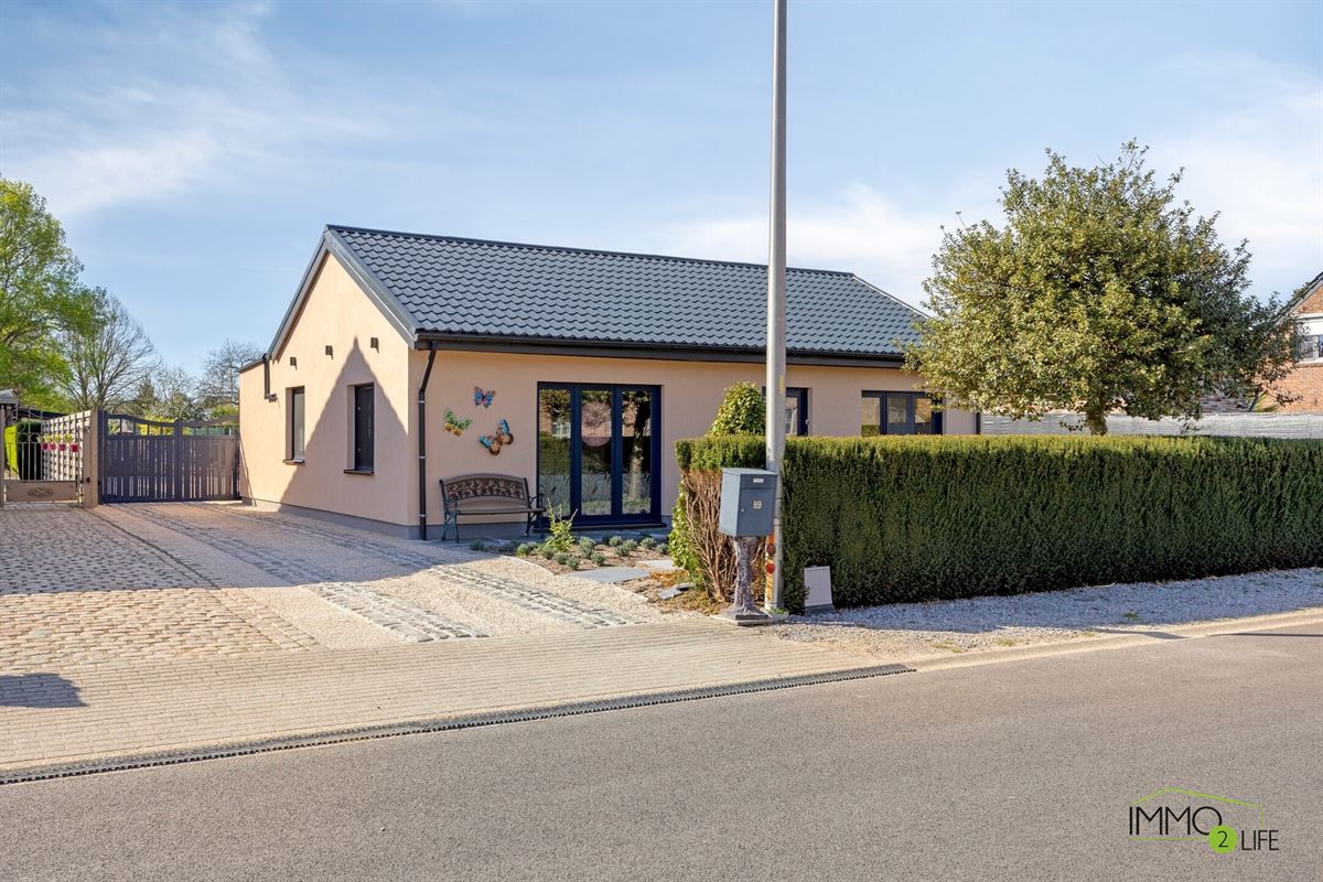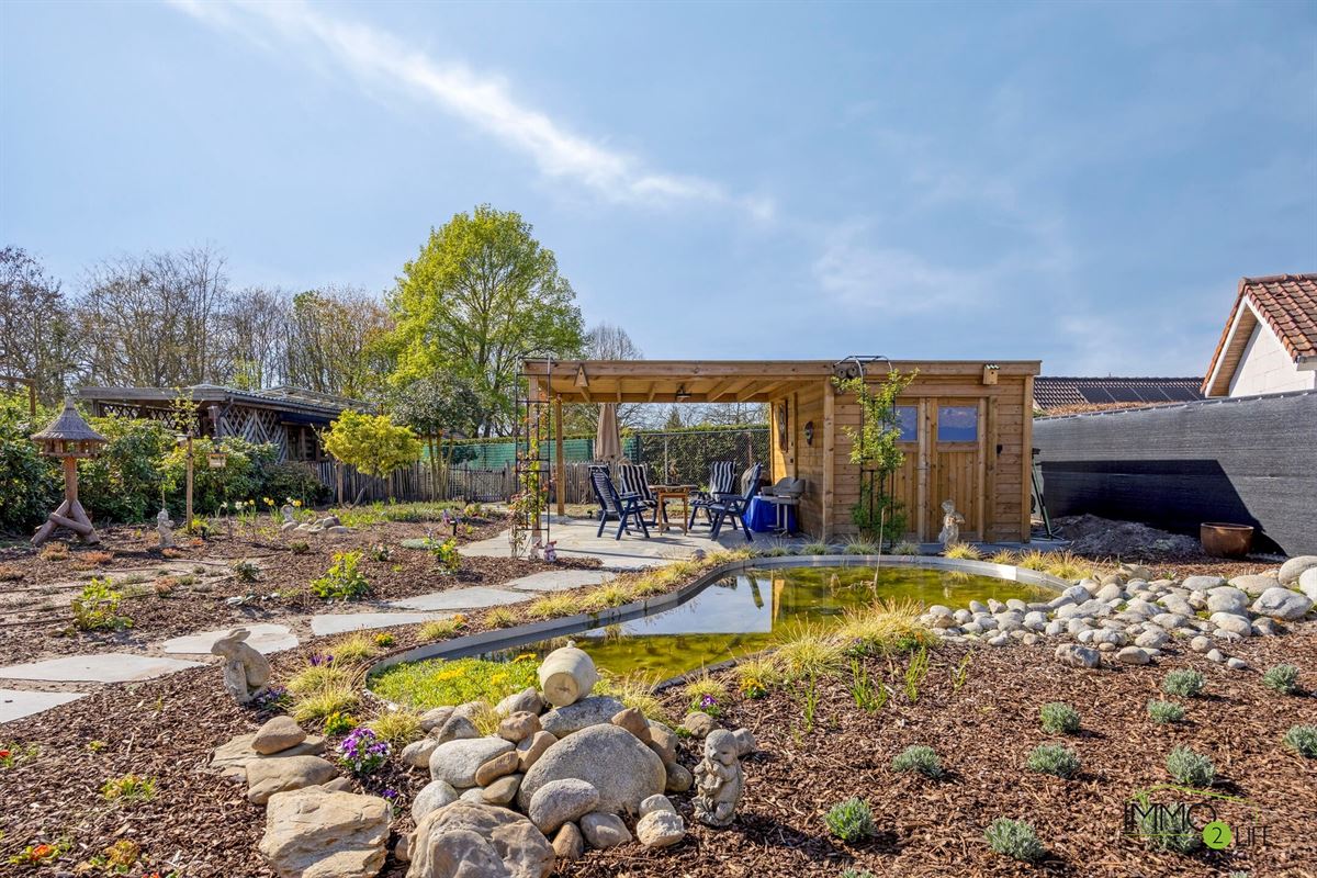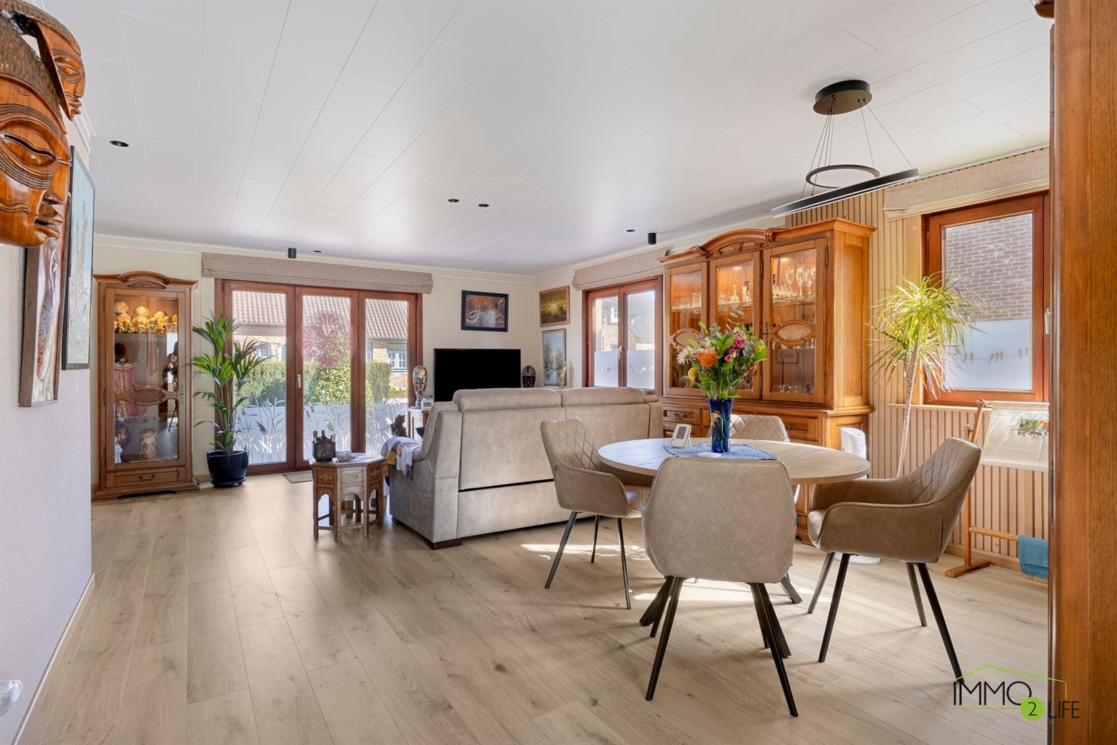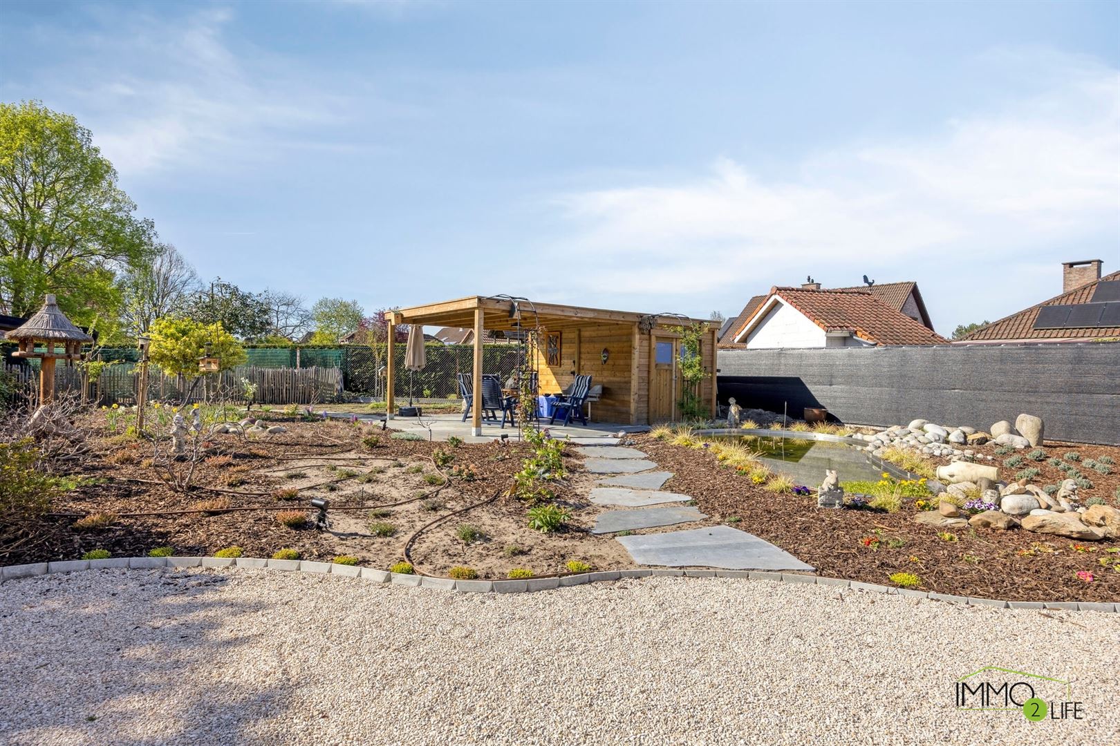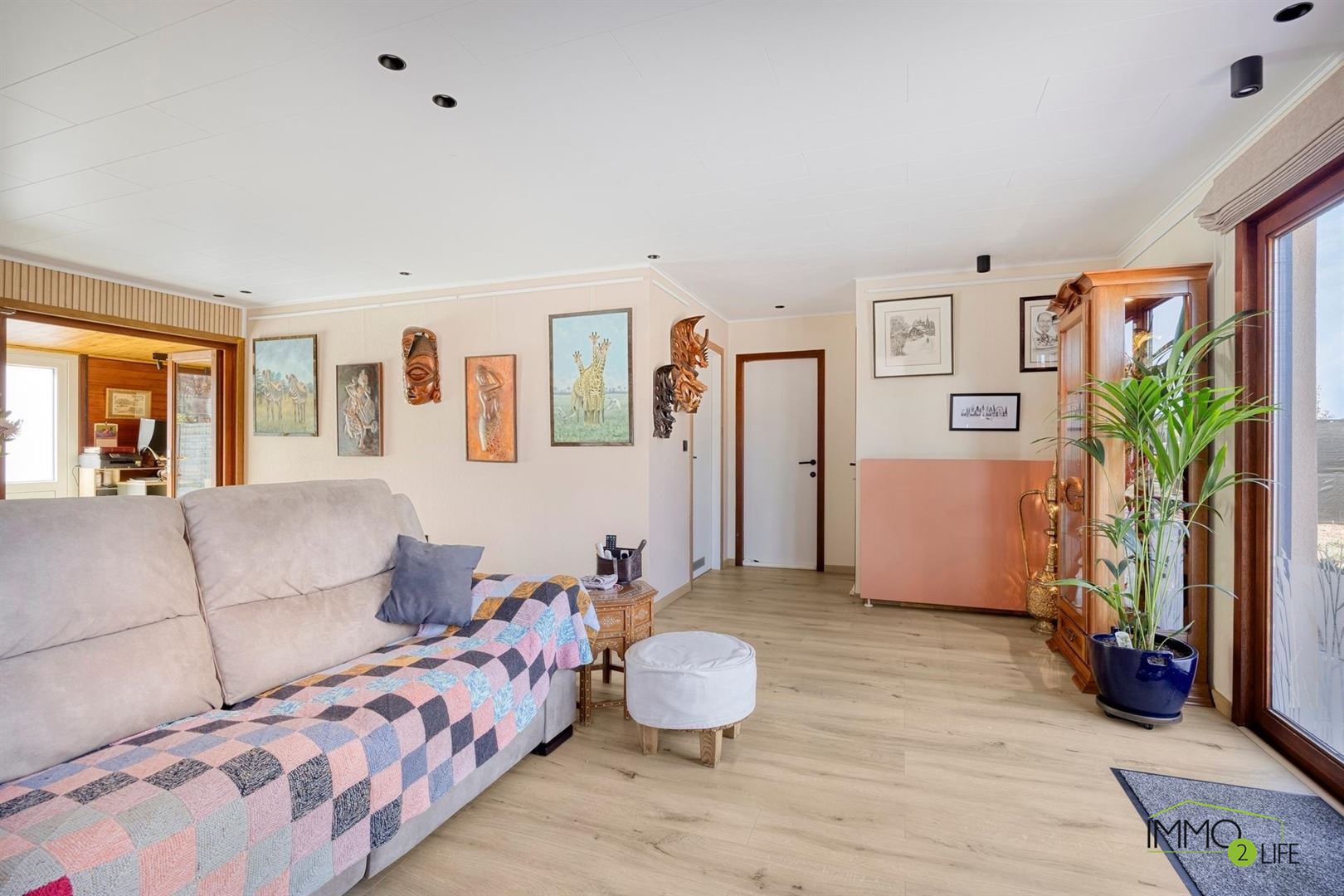 De woning verwelkomt u via een verzorgde inkomhal en biedt een lichtrijke, ruime woon- en eetkamer met directe toegang tot de westgeoriënteerde veranda, waar u geniet van een prachtig zicht op de tuin. Aansluitend bevindt zich de volledig ingebouwde keuken, uitgerust met kwalitatieve toestellen. Verder beschikt de woning over een praktische wasruimte met maatkasten en discreet weggewerkte toestellen, met toegang tot zowel de garage als de tuin met vijver en de aanpalende carport. De badkamer is voorzien van een douche, toilet en wastafel en sluit aan op de master bedroom. Daarnaast bevindt zich naast de inkomhal een 2de volwaardige slaapkamer, die eveneens toegang biedt tot de zolderruimte.