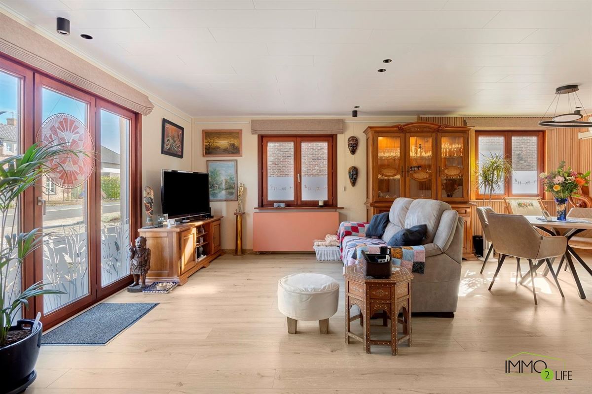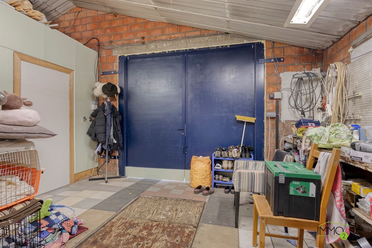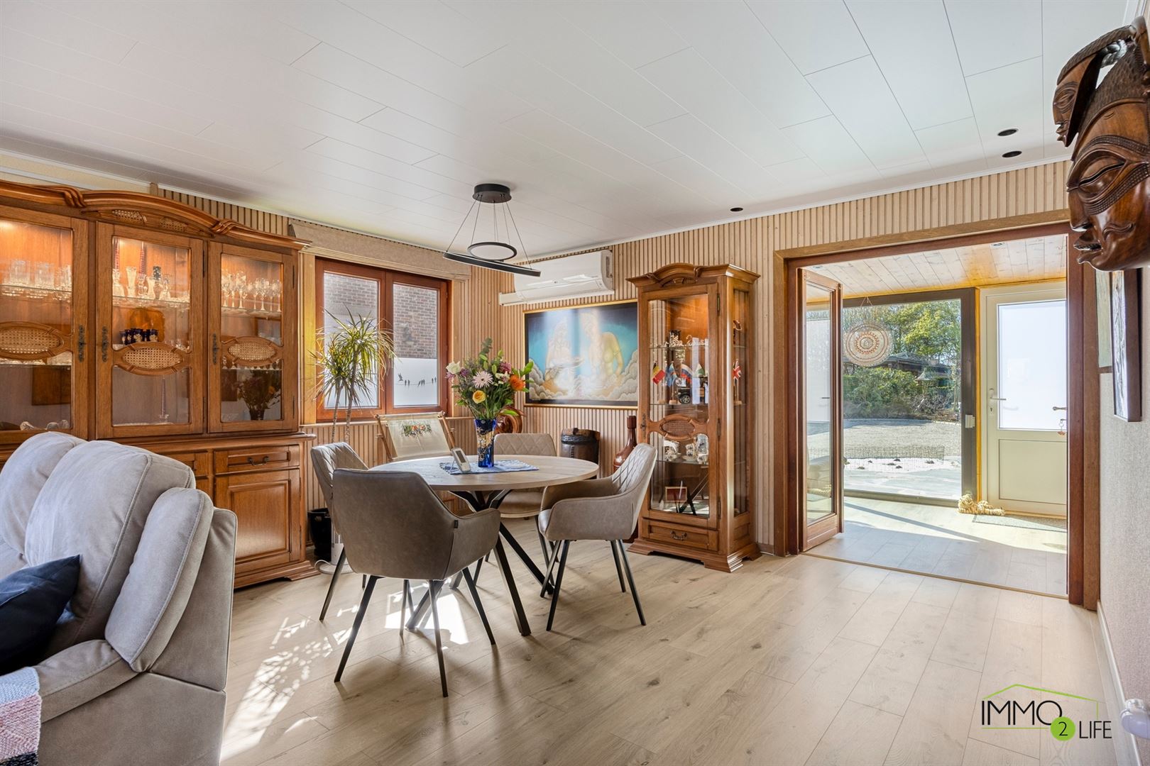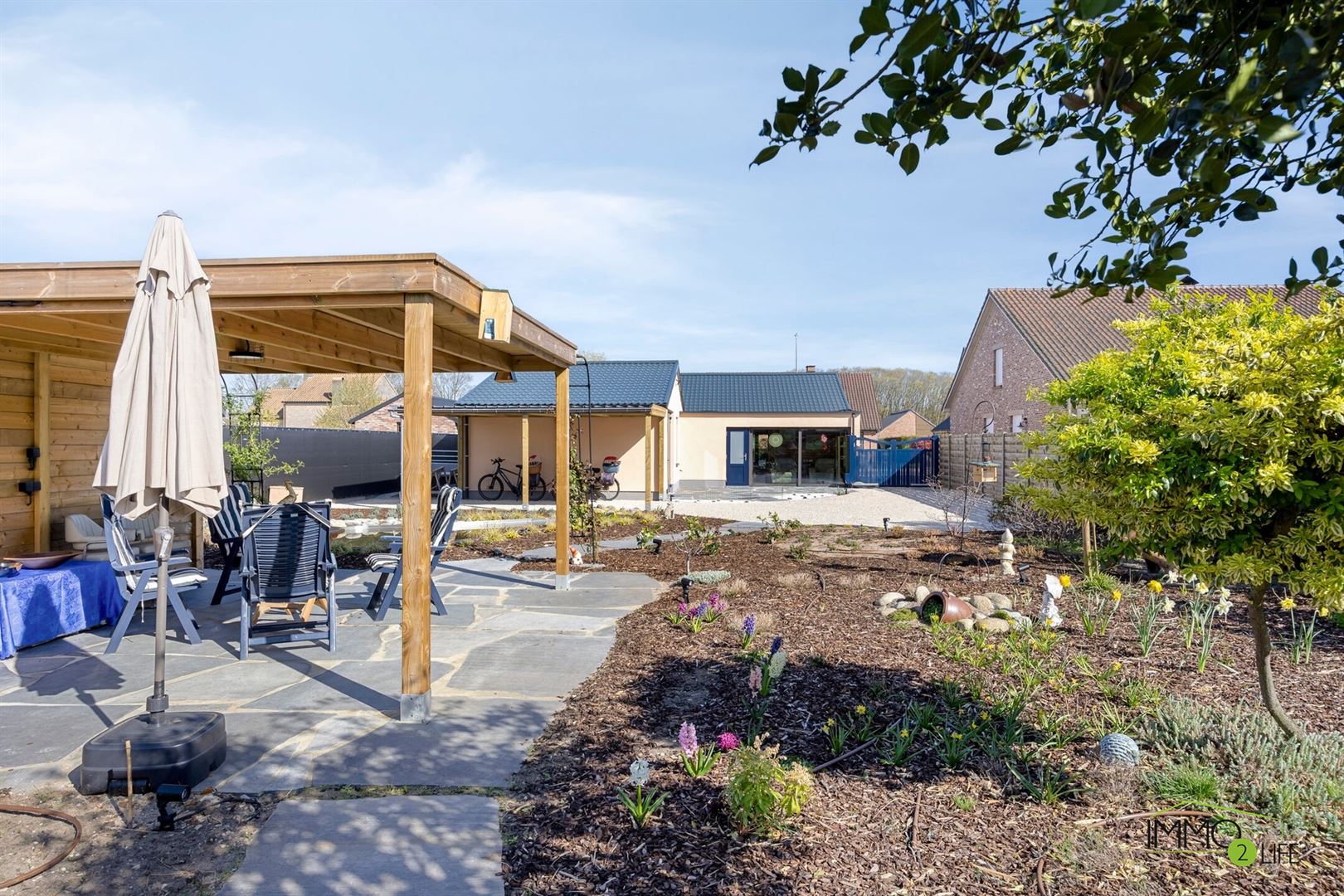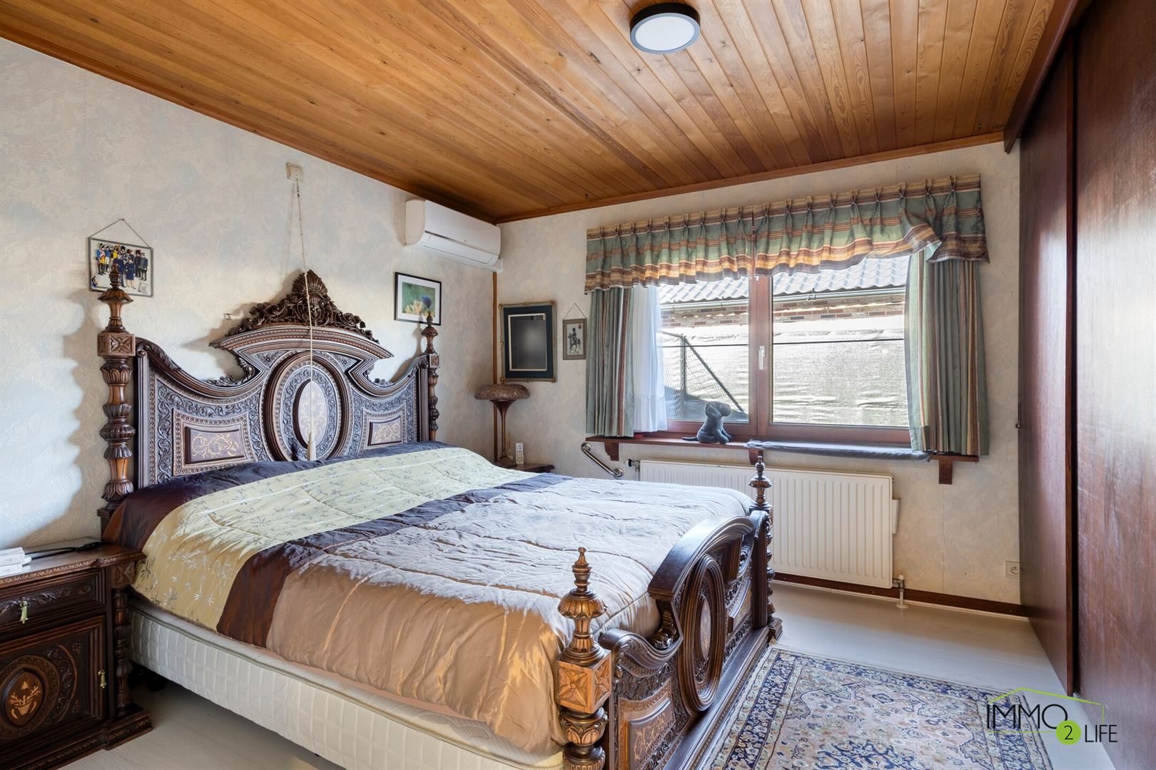 De woning verwelkomt u via een verzorgde inkomhal en biedt een lichtrijke, ruime woon- en eetkamer met directe toegang tot de westgeoriënteerde veranda, waar u geniet van een prachtig zicht op de tuin. Aansluitend bevindt zich de volledig ingebouwde keuken, uitgerust met kwalitatieve toestellen. Verder beschikt de woning over een praktische wasruimte met maatkasten en discreet weggewerkte toestellen, met toegang tot zowel de garage als de tuin met vijver en de aanpalende carport. De badkamer is voorzien van een douche, toilet en wastafel en sluit aan op de master bedroom. Daarnaast bevindt zich naast de inkomhal een 2de volwaardige slaapkamer, die eveneens toegang biedt tot de zolderruimte.