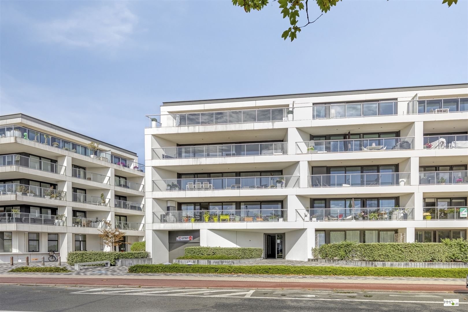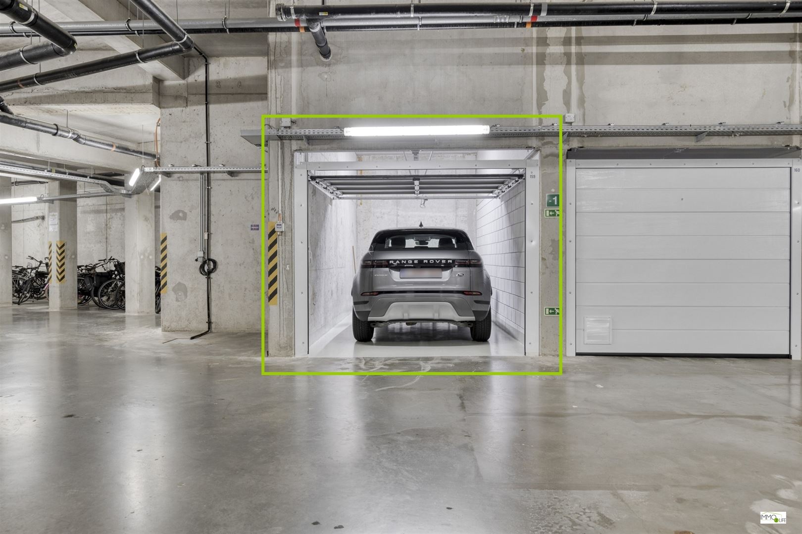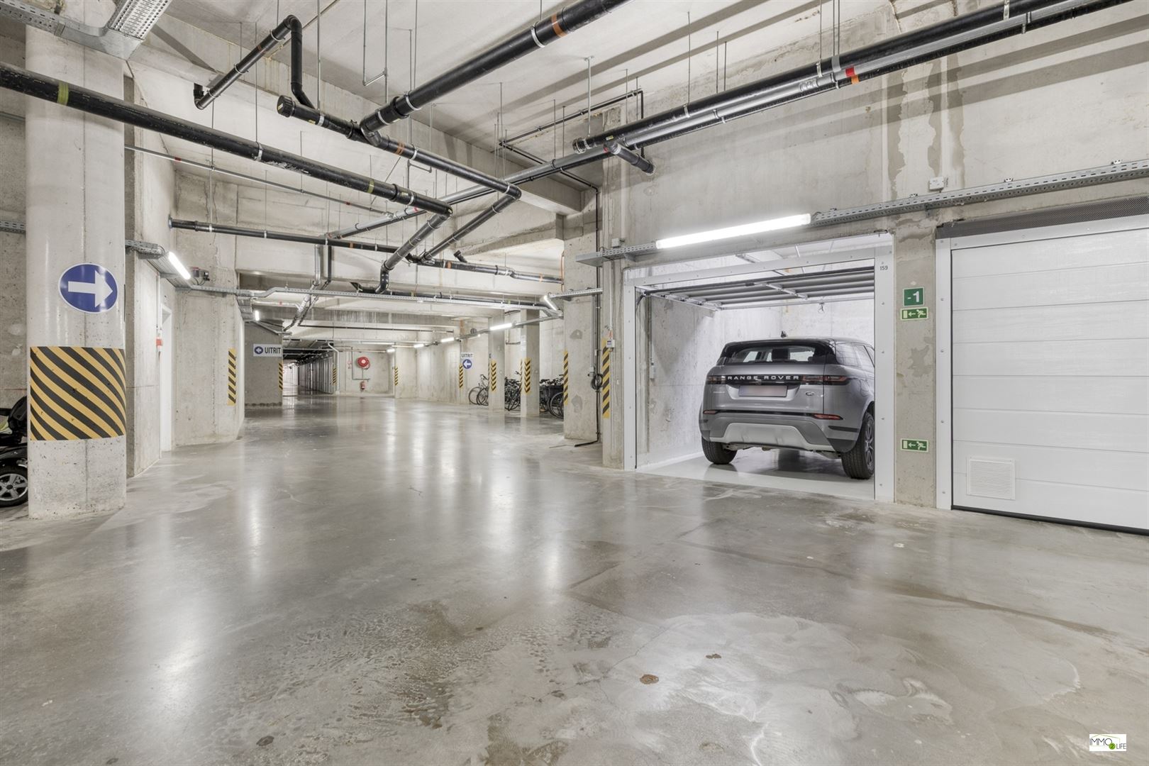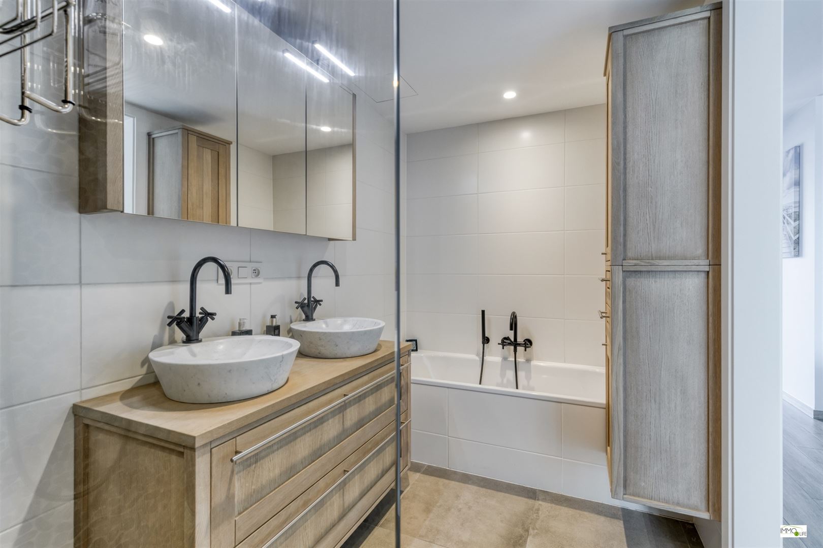 Inkomhal met ingewerkte vestiairekast en apart gastentoilet, ruime en lichtrijke woonkamer (49,6 m²) met grote raampartijen en toegang tot het zuidgerichte terras (25 m²), open en volledig uitgeruste keuken voorzien van kwalitatieve inbouwtoestellen, praktische wasplaats/technische berging, 3 volwaardige slaapkamers (15,6 m² - 12,1 m² - 10,9 m²) met ingemaakte kasten en luxueuze badkamer (met inloopdouche, ligbad en dubbele wastafel). Inclusief privatieve garagebox met sectionale poort en een gemeenschappelijke fietsenberging in de kelderverdieping.