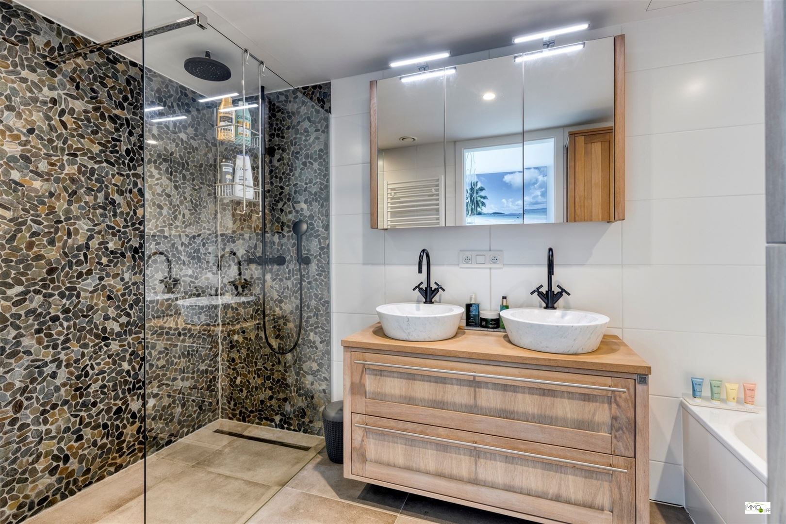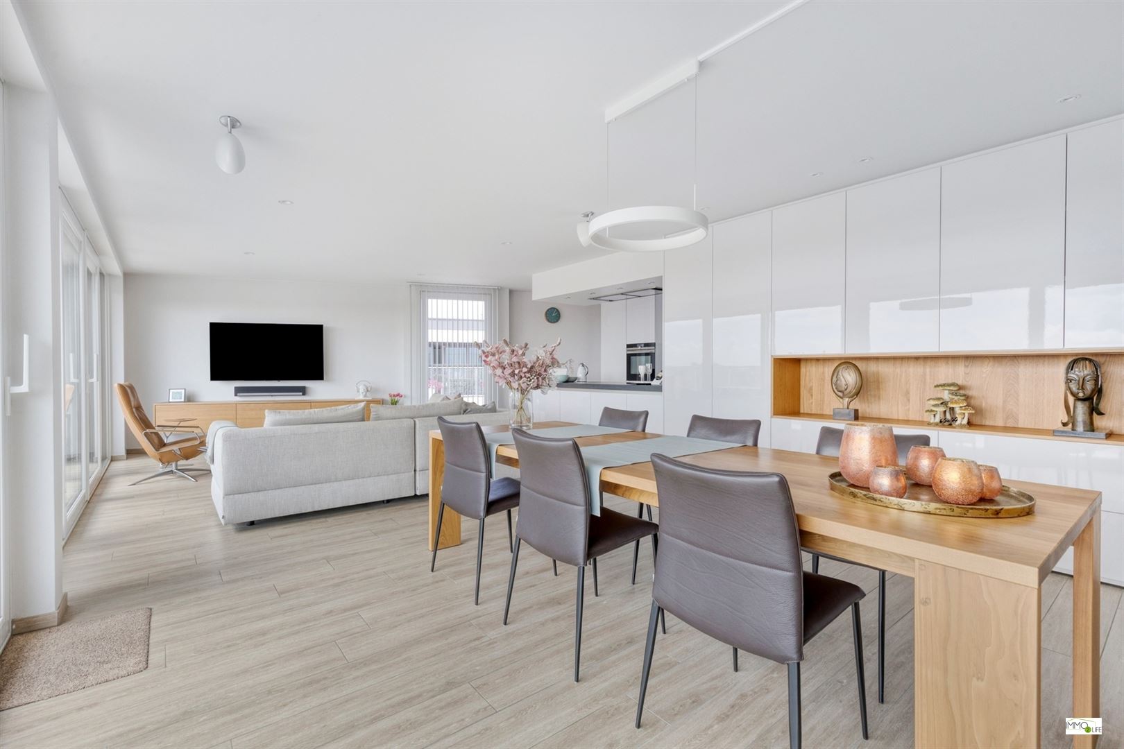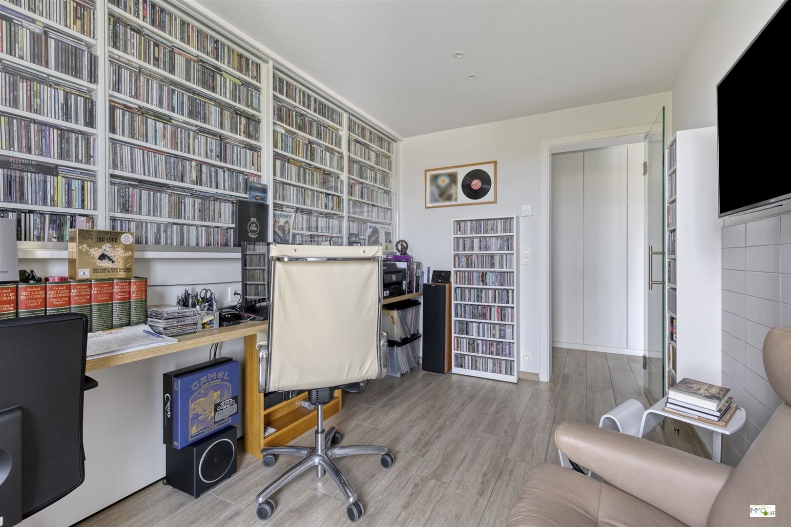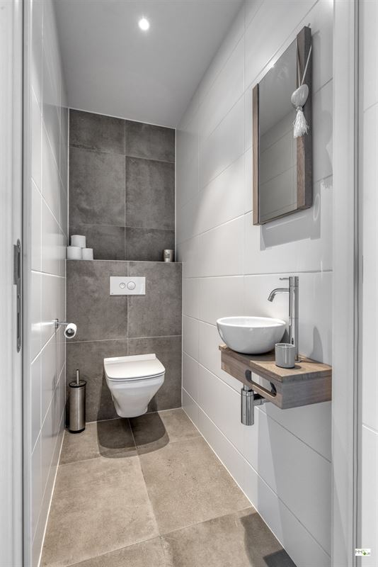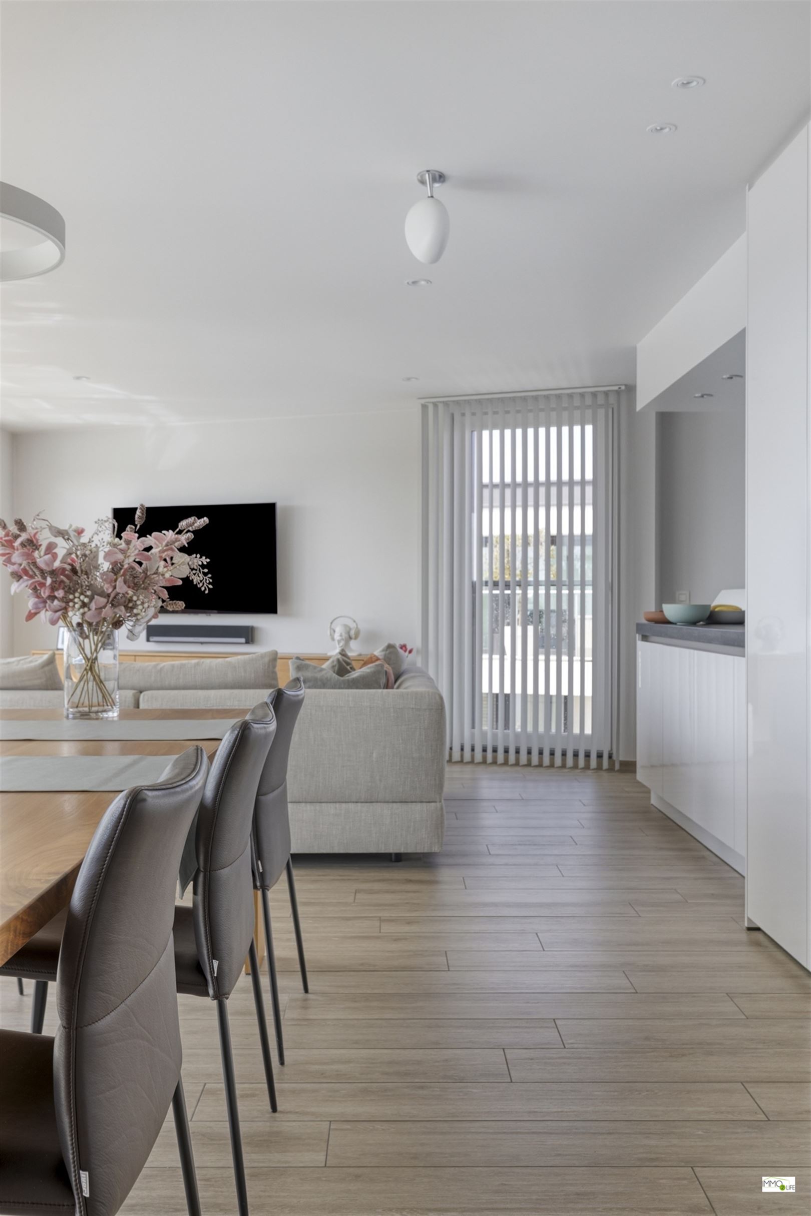 Inkomhal met ingewerkte vestiairekast en apart gastentoilet, ruime en lichtrijke woonkamer (49,6 m²) met grote raampartijen en toegang tot het zuidgerichte terras (25 m²), open en volledig uitgeruste keuken voorzien van kwalitatieve inbouwtoestellen, praktische wasplaats/technische berging, 3 volwaardige slaapkamers (15,6 m² - 12,1 m² - 10,9 m²) met ingemaakte kasten en luxueuze badkamer (met inloopdouche, ligbad en dubbele wastafel). Inclusief privatieve garagebox met sectionale poort en een gemeenschappelijke fietsenberging in de kelderverdieping.