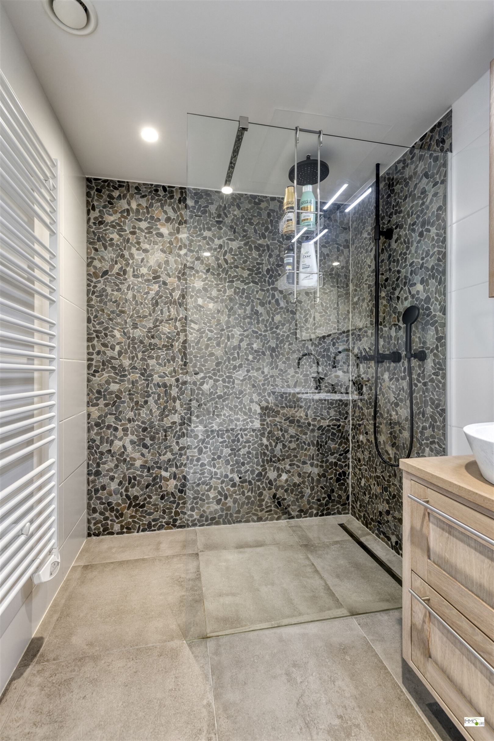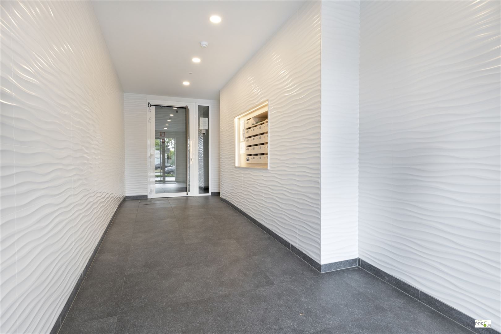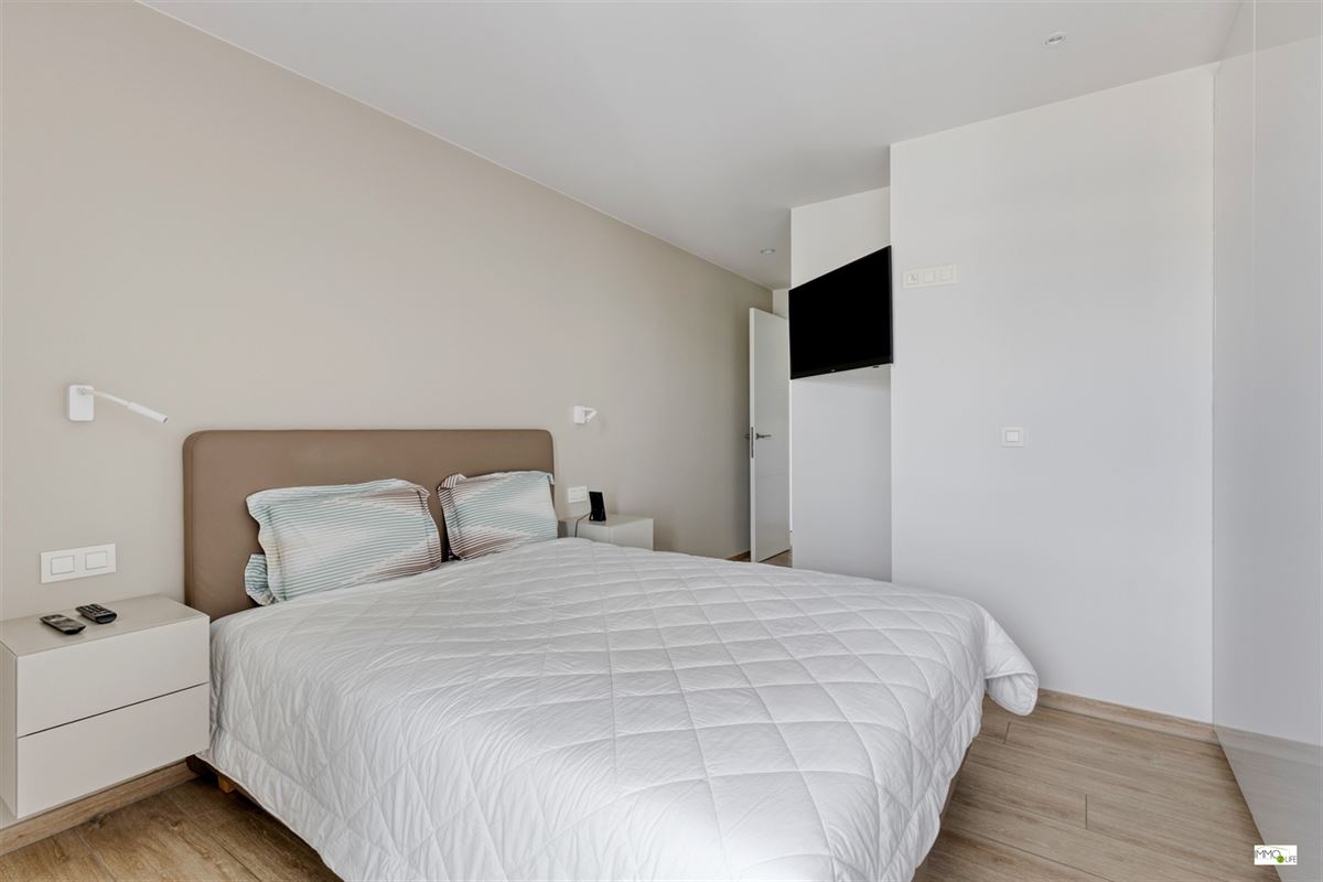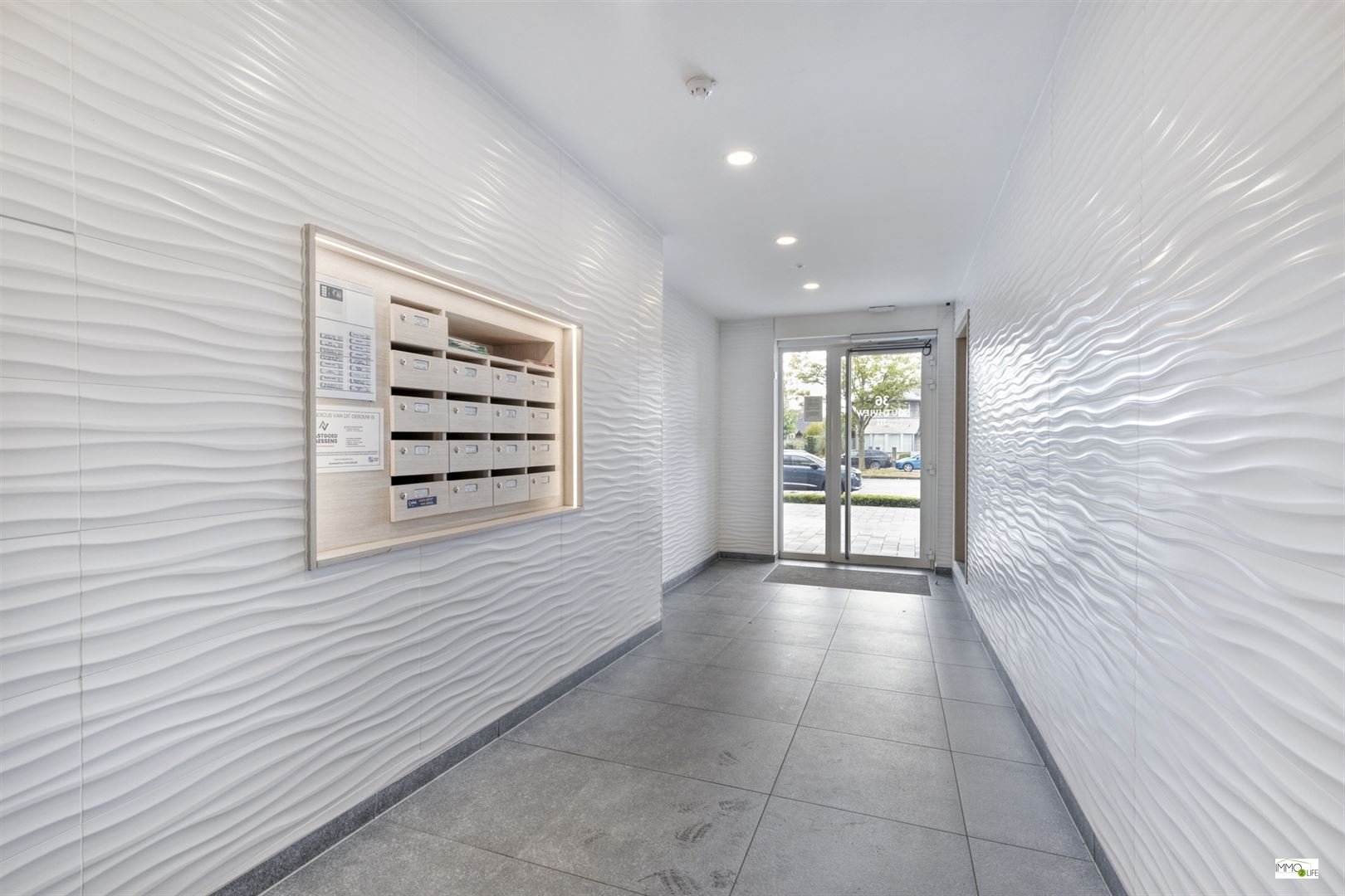 Inkomhal met ingewerkte vestiairekast en apart gastentoilet, ruime en lichtrijke woonkamer (49,6 m²) met grote raampartijen en toegang tot het zuidgerichte terras (25 m²), open en volledig uitgeruste keuken voorzien van kwalitatieve inbouwtoestellen, praktische wasplaats/technische berging, 3 volwaardige slaapkamers (15,6 m² - 12,1 m² - 10,9 m²) met ingemaakte kasten en luxueuze badkamer (met inloopdouche, ligbad en dubbele wastafel). Inclusief privatieve garagebox met sectionale poort en een gemeenschappelijke fietsenberging in de kelderverdieping.