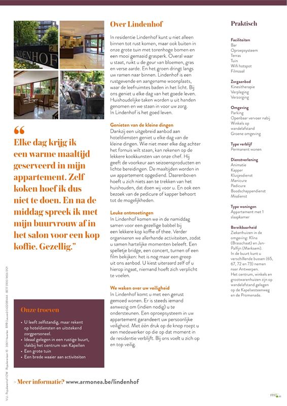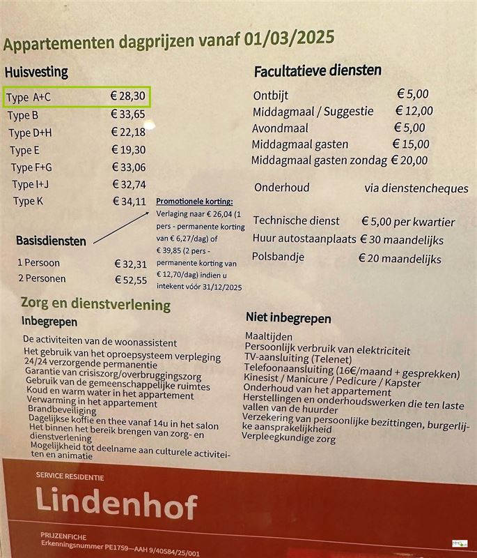 * De bewoner van het appartement betaalt daarnaast een bedrag van 32,31 EURO per dag aan 'residentie Lindenhof' voor de basisdiensten (voor 2 personen bedraagt dit 52,55 EURO), dit betreft een forfait voor zorg en dienstverlening (inbegrepen: o.a. koud en warm water in het appartement, verwarming in het appartement, 24/24 verzorgende permanentie, gebruik van het oproepsysteem verpleging, activiteiten van de woonassistent, gebruik van de gemeenschappelijke ruimtes, brandbeveiliging, garantie van crisiszorg/overbruggingszorg, dagelijks koffie/thee vanaf 14u in het salon, mogelijkheid tot deelname aan culturele activiteiten en animatie,enz.).