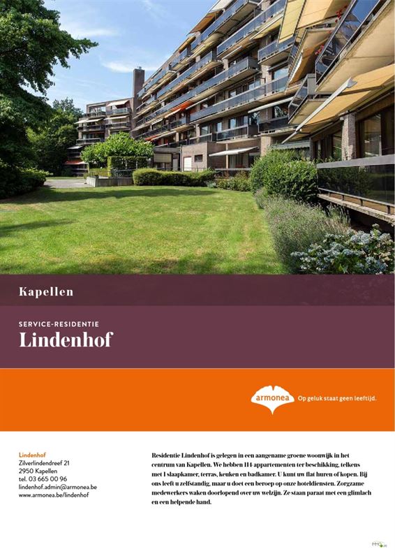 Het betreft een lichtrijk 1-slaapkamerappartement (46 m²) met zuidgericht terras, gelegen op de 4de verdieping van de residentie "Lindenhof" te Kapellen. Deze residentie situeert zich op een rustige en bevoorrechte locatie, in een aangename en groene woonwijk op wandelafstand van het centrum (700 m). In de nabije omgeving bevinden zich verschillende handelszaken, grootwarenhuizen, het Klina ziekenhuis (7 km) en zorgt het openbaar vervoer voor vlotte verbindingen naar o.a. Antwerpen.