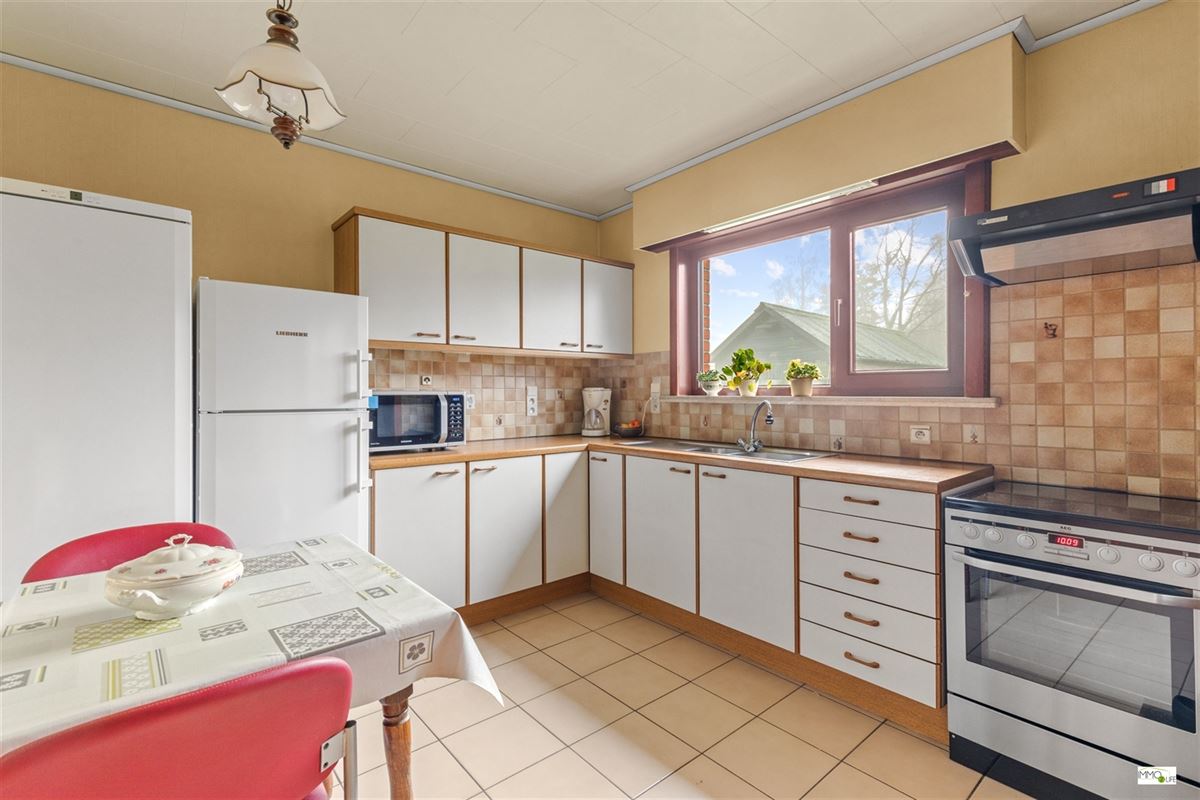 De indeling is als volgt: inkomhal/nachthal (14,9 m²), berging/technische ruimte (4,2 m²), 2 slaapkamers (13,1 m² - 11,3 m²) en uitgeruste badkamer (5,6 m²) met douche, enkele wastafel en toilet. De lichtrijke woon- en eetkamer (29,9 m²) met open haard staat in verbinding met de ingerichte keuken (9,6 m²) met aparte koele berging/voorraadkamer (5,1 m²), die toegang biedt tot het overdekte terras en de gigantische tuin met achterliggend bos. Achteraan de oprit is er een ruime aparte garage (27,3 m²) voorzien.