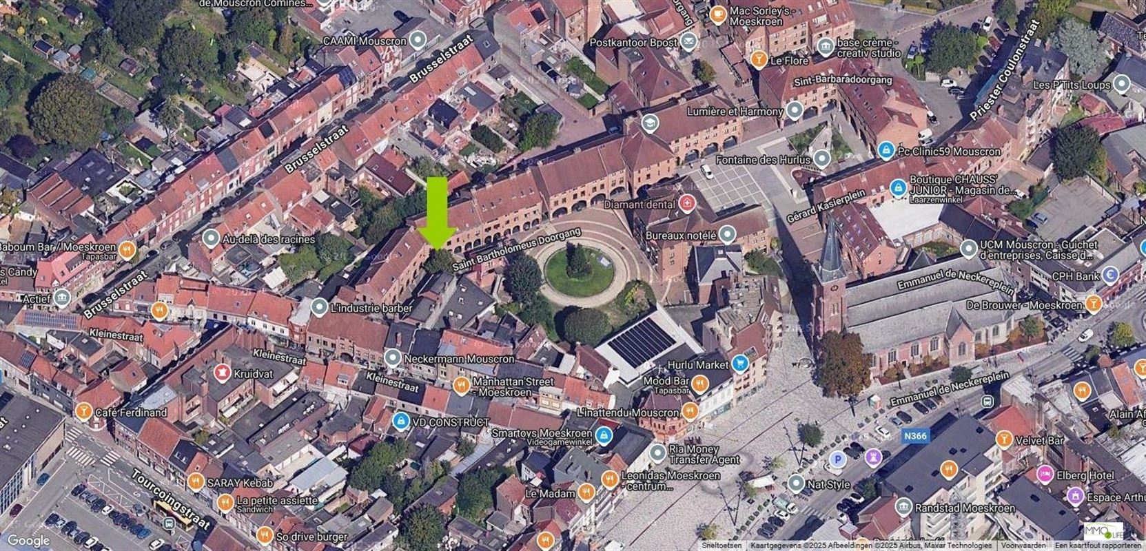 Het pand bevindt zich op een zéér goede commerciële ligging in het centrum van Moeskroen, vlakbij het gemeentelijk park en ziekenhuis van Moeskroen.