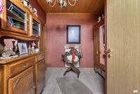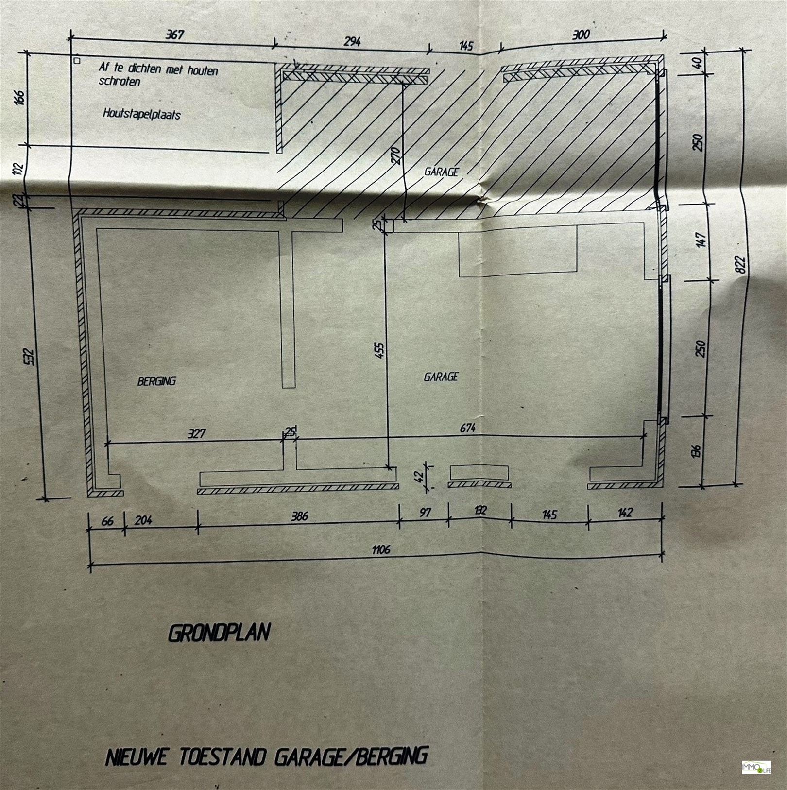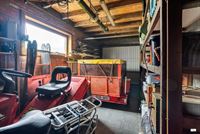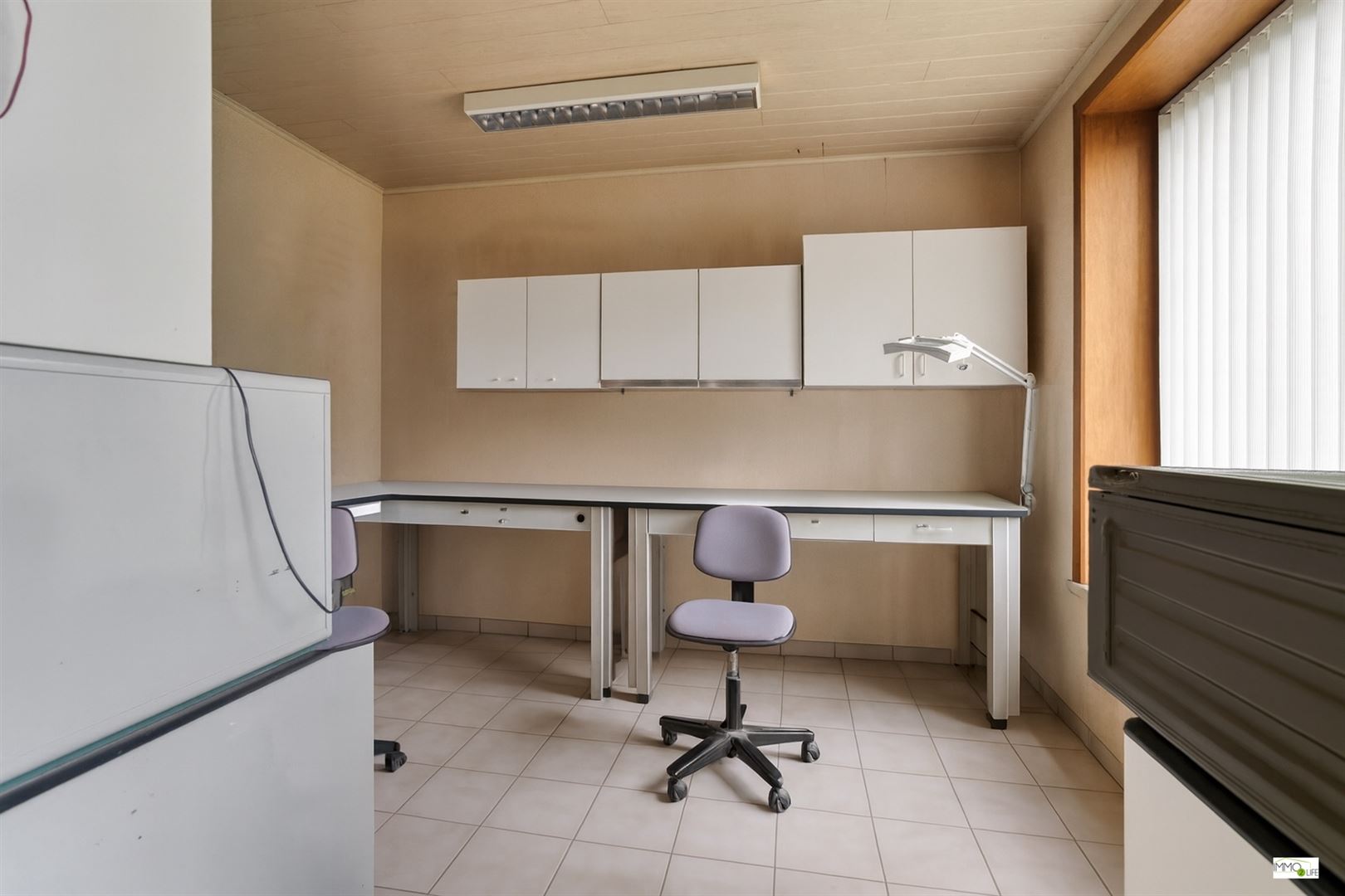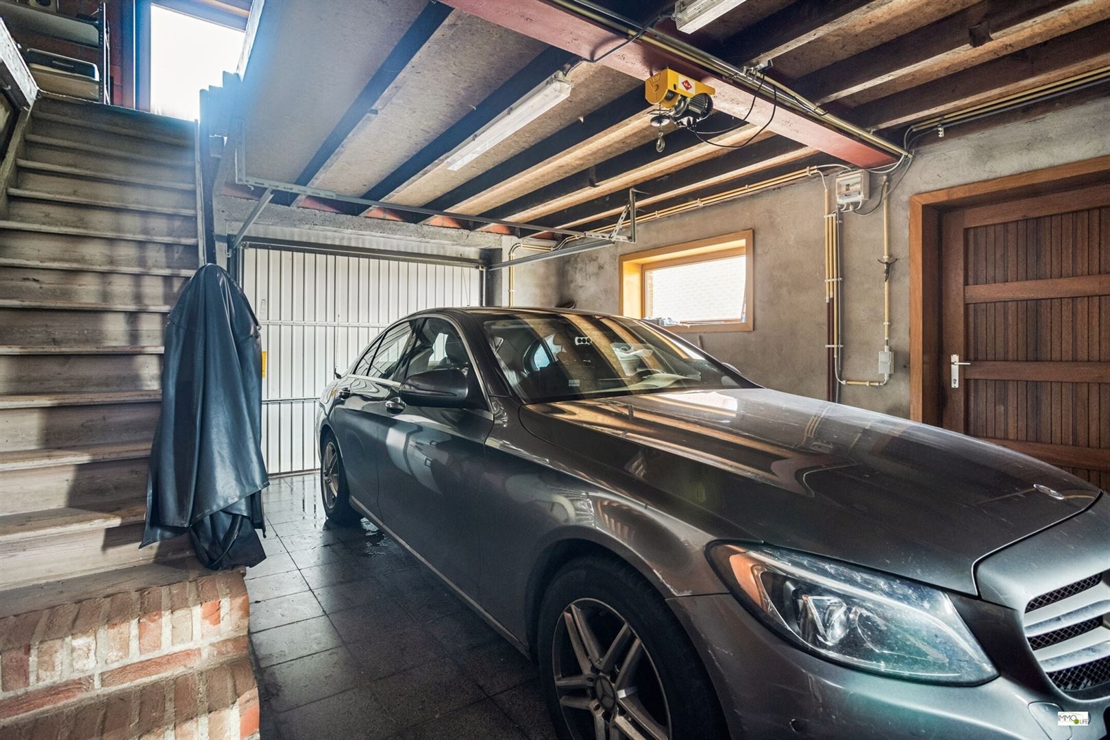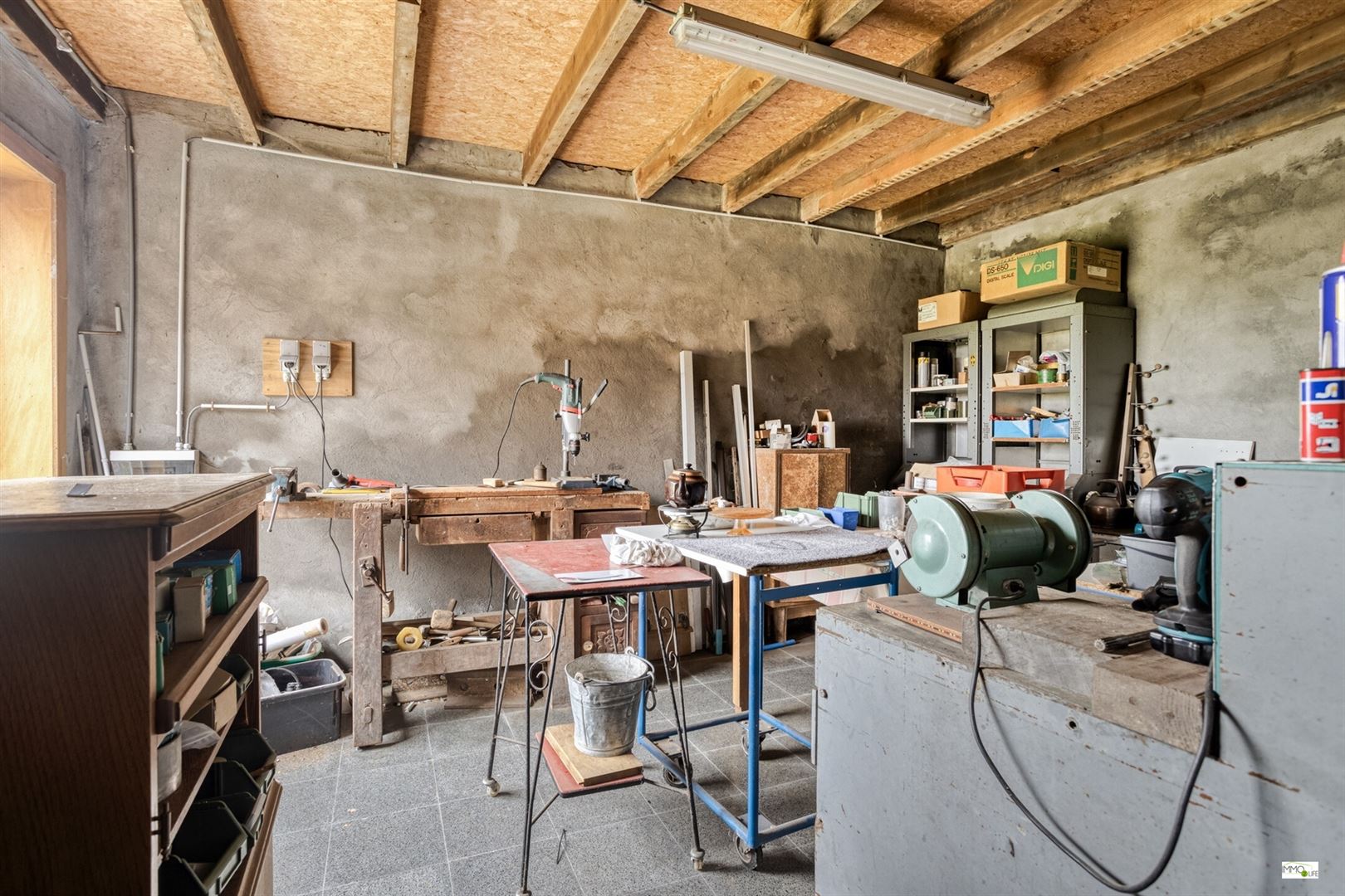 De private oprit leidt tevens naar een bijgebouw met dubbele garage (48,9 m²), werkatelier of hobbyruimte (14,9 m²), houtstapelplaats (8,8 m²) en een grote open ruimte over de volledige verdieping. Via een trapluik kan men hier ook nog naar de dakverdieping.